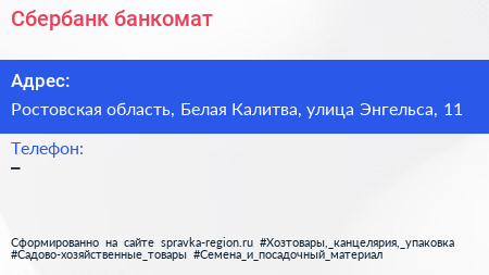 Сбербанк, банкомат по адресу Ростовская область, Белая Калитва, улица Энгельса, 11 в дальнейшем Организация, размещена в следующих категориях: