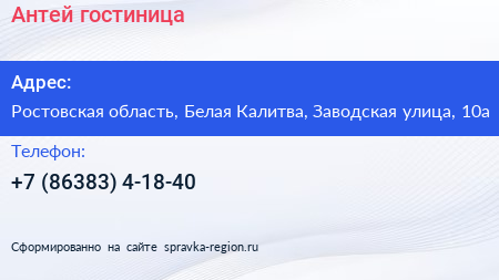 Антей, гостиница по адресу Ростовская область, Белая Калитва, Заводская улица, 10а в дальнейшем Организация, размещена в следующих категориях: