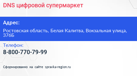 DNS, цифровой супермаркет по адресу Ростовская область, Белая Калитва, Вокзальная улица, 376Б в дальнейшем Организация, размещена в следующих категориях: