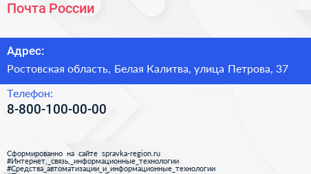 Почта России по адресу Ростовская область, Белая Калитва, улица Петрова, 37 в дальнейшем Организация, размещена в следующих категориях: