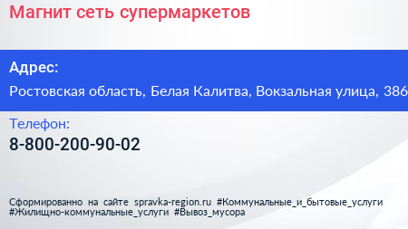 Магнит, сеть супермаркетов по адресу Ростовская область, Белая Калитва, Вокзальная улица, 386 в дальнейшем Организация, размещена в следующих категориях: