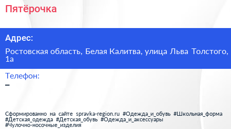 Пятёрочка по адресу Ростовская область, Белая Калитва, улица Льва Толстого, 1а в дальнейшем Организация, размещена в следующих категориях: