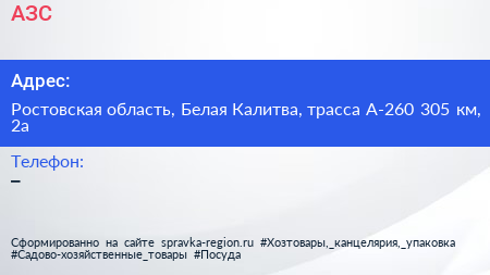 АЗС по адресу Ростовская область, Белая Калитва, трасса А-260 305 км, 2а в дальнейшем Организация, размещена в следующих категориях: