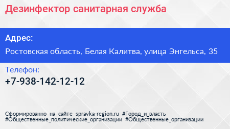Дезинфектор, санитарная служба по адресу Ростовская область, Белая Калитва, улица Энгельса, 35 в дальнейшем Организация, размещена в следующих категориях: