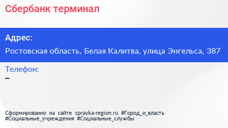Сбербанк, терминал по адресу Ростовская область, Белая Калитва, улица Энгельса, 387 в дальнейшем Организация, размещена в следующих категориях: