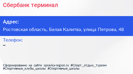 Сбербанк, терминал по адресу Ростовская область, Белая Калитва, улица Петрова, 48 в дальнейшем Организация, размещена в следующих категориях: