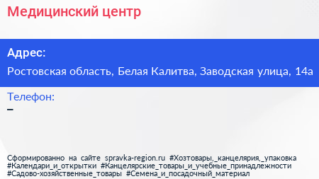 Медицинский центр по адресу Ростовская область, Белая Калитва, Заводская улица, 14а в дальнейшем Организация, размещена в следующих категориях: