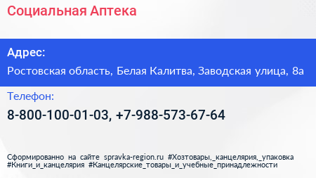 Социальная Аптека по адресу Ростовская область, Белая Калитва, Заводская улица, 8а в дальнейшем Организация, размещена в следующих категориях: