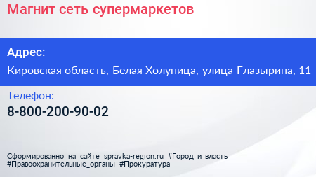 Магнит, сеть супермаркетов по адресу Кировская область, Белая Холуница, улица Глазырина, 11 в дальнейшем Организация, размещена в следующих категориях:
