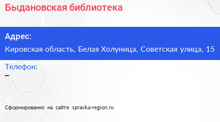 Быдановская библиотека по адресу Кировская область, Белая Холуница, Советская улица, 15 в дальнейшем Организация, размещена в следующих категориях: