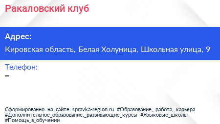 Ракаловский клуб по адресу Кировская область, Белая Холуница, Школьная улица, 9 в дальнейшем Организация, размещена в следующих категориях: