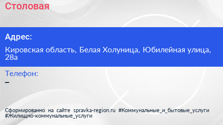 Столовая по адресу Кировская область, Белая Холуница, Юбилейная улица, 28а в дальнейшем Организация, размещена в следующих категориях: