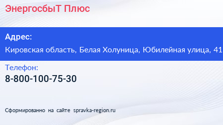 ЭнергосбыТ Плюс по адресу Кировская область, Белая Холуница, Юбилейная улица, 41 в дальнейшем Организация, размещена в следующих категориях: