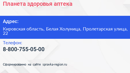 Планета здоровья, аптека по адресу Кировская область, Белая Холуница, Пролетарская улица, 22 в дальнейшем Организация, размещена в следующих категориях: