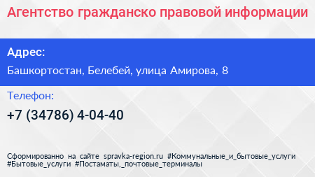 Агентство гражданско-правовой информации по адресу Башкортостан, Белебей, улица Амирова, 8 в дальнейшем Организация, размещена в следующих категориях: