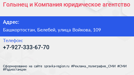 Голынец и Компания, юридическое агентство по адресу Башкортостан, Белебей, улица Войкова, 109 в дальнейшем Организация, размещена в следующих категориях: