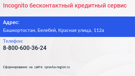 Incognito, бесконтактный кредитный сервис по адресу Башкортостан, Белебей, Красная улица, 112а в дальнейшем Организация, размещена в следующих категориях: