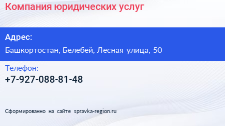 Компания юридических услуг по адресу Башкортостан, Белебей, Лесная улица, 50 в дальнейшем Организация, размещена в следующих категориях: