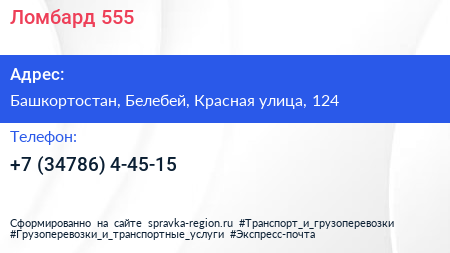 Ломбард-555 по адресу Башкортостан, Белебей, Красная улица, 124 в дальнейшем Организация, размещена в следующих категориях: