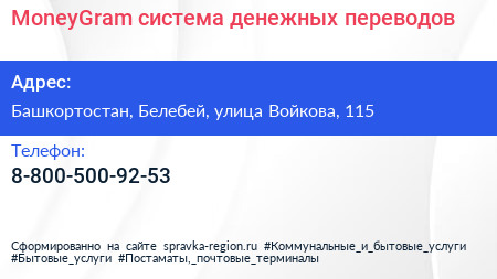 MoneyGram, система денежных переводов по адресу Башкортостан, Белебей, улица Войкова, 115 в дальнейшем Организация, размещена в следующих категориях: