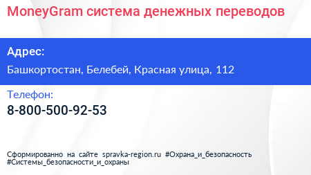 MoneyGram, система денежных переводов по адресу Башкортостан, Белебей, Красная улица, 112 в дальнейшем Организация, размещена в следующих категориях: