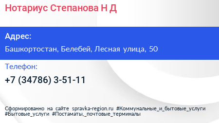 Нотариус Степанова Н.Д. по адресу Башкортостан, Белебей, Лесная улица, 50 в дальнейшем Организация, размещена в следующих категориях: