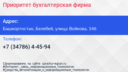 Приоритет, бухгалтерская фирма по адресу Башкортостан, Белебей, улица Войкова, 146 в дальнейшем Организация, размещена в следующих категориях: