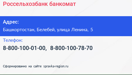 Россельхозбанк, банкомат по адресу Башкортостан, Белебей, улица Ленина, 5 в дальнейшем Организация, размещена в следующих категориях: