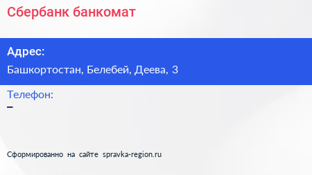 Сбербанк, банкомат по адресу Башкортостан, Белебей, Деева, 3 в дальнейшем Организация, размещена в следующих категориях: