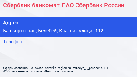 Сбербанк, банкомат, ПАО Сбербанк России по адресу Башкортостан, Белебей, Красная улица, 112 в дальнейшем Организация, размещена в следующих категориях: