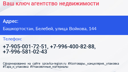 Ваш ключ, агентство недвижимости по адресу Башкортостан, Белебей, улица Войкова, 144 в дальнейшем Организация, размещена в следующих категориях: