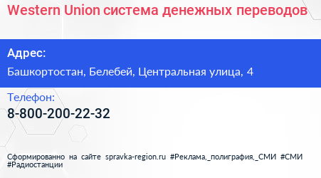 Western Union, система денежных переводов по адресу Башкортостан, Белебей, Центральная улица, 4 в дальнейшем Организация, размещена в следующих категориях: