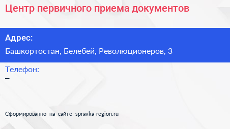 Центр первичного приема документов по адресу Башкортостан, Белебей, Революционеров, 3 в дальнейшем Организация, размещена в следующих категориях:
