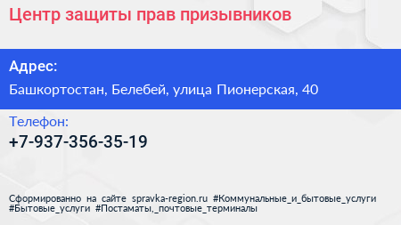 Центр защиты прав призывников по адресу Башкортостан, Белебей, улица Пионерская, 40 в дальнейшем Организация, размещена в следующих категориях: