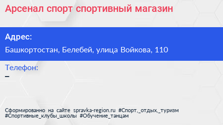 Арсенал спорт, спортивный магазин по адресу Башкортостан, Белебей, улица Войкова, 110 в дальнейшем Организация, размещена в следующих категориях: