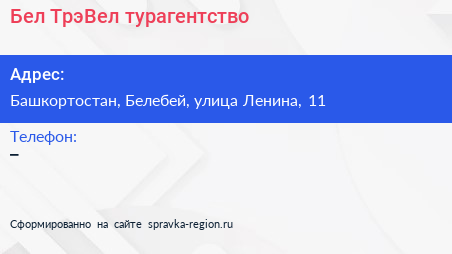 Бел-ТрэВел, турагентство по адресу Башкортостан, Белебей, улица Ленина, 11 в дальнейшем Организация, размещена в следующих категориях: