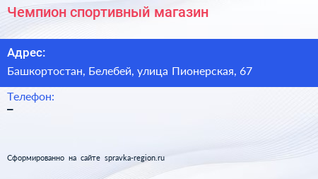 Чемпион, спортивный магазин по адресу Башкортостан, Белебей, улица Пионерская, 67 в дальнейшем Организация, размещена в следующих категориях: