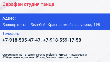 Сарафан, студия танца по адресу Башкортостан, Белебей, Красноармейская улица, 198 в дальнейшем Организация, размещена в следующих категориях: