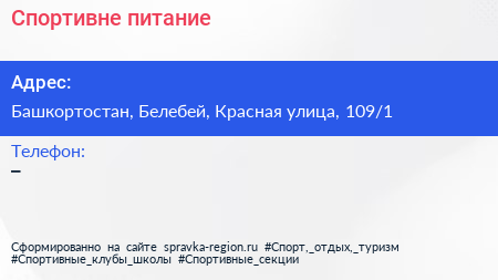 Спортивне питание по адресу Башкортостан, Белебей, Красная улица, 109/1 в дальнейшем Организация, размещена в следующих категориях: