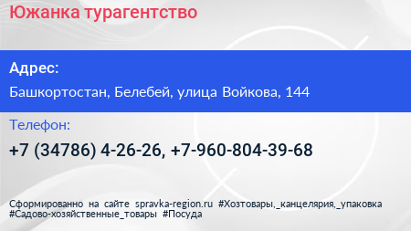 Южанка, турагентство по адресу Башкортостан, Белебей, улица Войкова, 144 в дальнейшем Организация, размещена в следующих категориях: