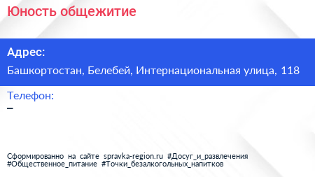 Юность, общежитие по адресу Башкортостан, Белебей, Интернациональная улица, 118 в дальнейшем Организация, размещена в следующих категориях: