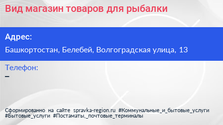 Вид, магазин товаров для рыбалки по адресу Башкортостан, Белебей, Волгоградская улица, 13 в дальнейшем Организация, размещена в следующих категориях: