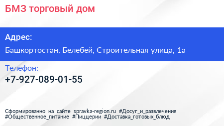 БМЗ, торговый дом по адресу Башкортостан, Белебей, Строительная улица, 1а в дальнейшем Организация, размещена в следующих категориях: