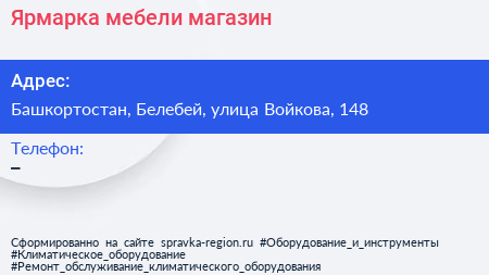 Ярмарка мебели, магазин по адресу Башкортостан, Белебей, улица Войкова, 148 в дальнейшем Организация, размещена в следующих категориях: