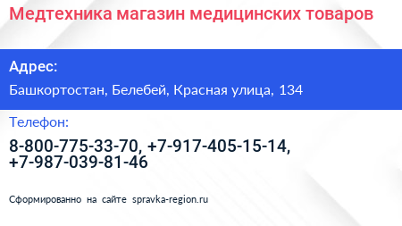 Медтехника, магазин медицинских товаров по адресу Башкортостан, Белебей, Красная улица, 134 в дальнейшем Организация, размещена в следующих категориях:
