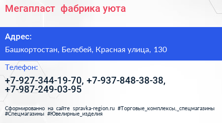 Мегапласт+, фабрика уюта по адресу Башкортостан, Белебей, Красная улица, 130 в дальнейшем Организация, размещена в следующих категориях: