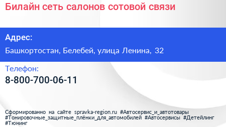 Билайн, сеть салонов сотовой связи по адресу Башкортостан, Белебей, улица Ленина, 32 в дальнейшем Организация, размещена в следующих категориях: