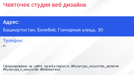 Чвяточек, студия веб-дизайна по адресу Башкортостан, Белебей, Гончарная улица, 30 в дальнейшем Организация, размещена в следующих категориях: