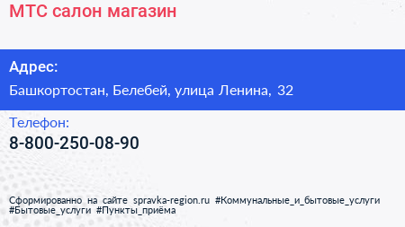 МТС, салон-магазин по адресу Башкортостан, Белебей, улица Ленина, 32 в дальнейшем Организация, размещена в следующих категориях: