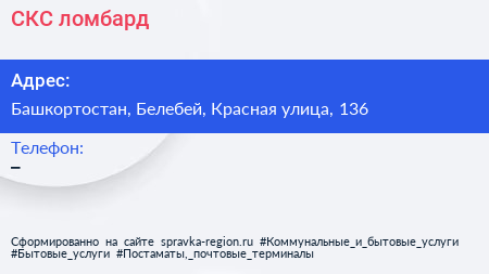 СКС ломбард по адресу Башкортостан, Белебей, Красная улица, 136 в дальнейшем Организация, размещена в следующих категориях: